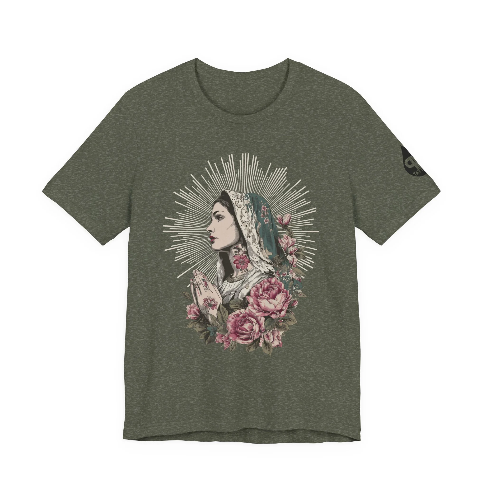 The Saint Tee captures the soul of classic tattoo iconography — radiant halo, detailed portrait, and floral devotion with a modern edge. It’s the softer side of strength, hand-drawn and permanently bold.